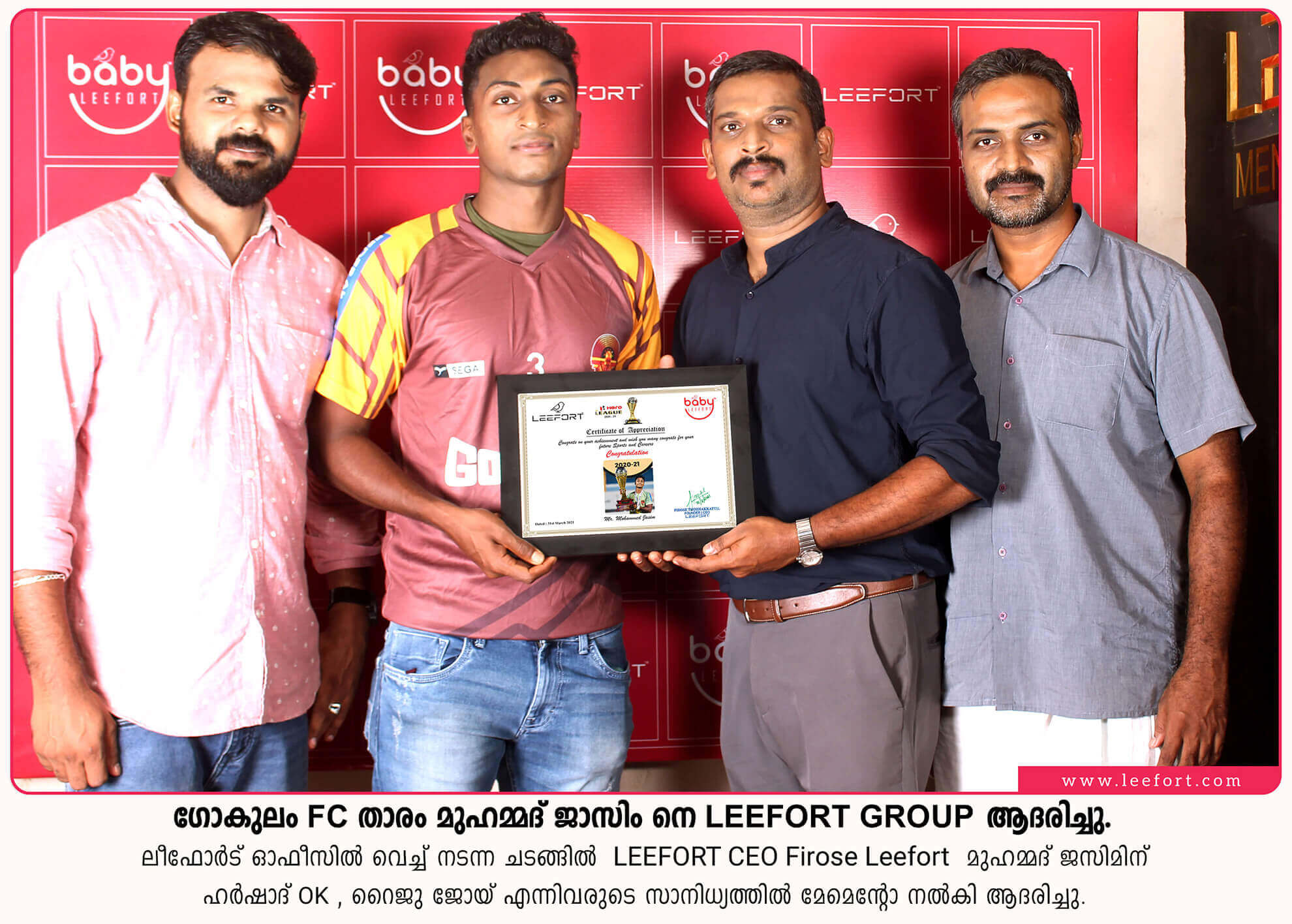 ആദ്യമായി ഒരു കേരള ടീം ഐ ലീഗ് ചാമ്പ്യന്മാരപ്പോൾ വളാഞ്ചേരിക്കും അഭിമാനിക്കാം...... കാൽപന്തു കളിയെ നെഞ്ചോട് ചേർത്ത് വെച്ച ഗ്രാമത്തിൽ നിന്നും ഗോകുലം ടീമിന്റെ ഭാഗമായി അവനുമുണ്ടായിരുന്നു. "മുഹമ്മദ് ജാസിം" നാട്ടുകാർക്കൊപ്പം പന്തുതട്ടി വളർന്ന് കളിമികവ് കൊണ്ടും പ്രയത്നം കൊണ്ടും ഗോകുലം ടീമിൽ സ്ഥാനമുറപ്പിച്ച ജാസിം, കേരള ടീം ചരിത്രം രചിച്ചപ്പോൾ അതിലൊരു ഭാഗമായിരിക്കുകയാണ്. മുഹമ്മദ് ജസിമിന് LEEFORT GROUP ൻ്റെ എല്ലാവിധ അഭിനന്ദനങ്ങളും.
